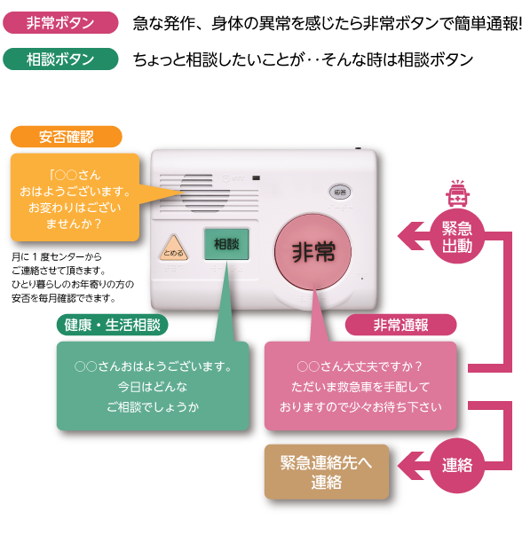 専用の通報装置をご自宅に設置させていただき、急な体調の変化など、緊急時にボタンをおすだけで当社のセンターに連絡できるサービスです。24時間365日、専任オペレーターとハンズフリーで会話することができ、救急車の手配やご家族への連絡等、ご利用者様にあった適切な対応を迅速に行います。